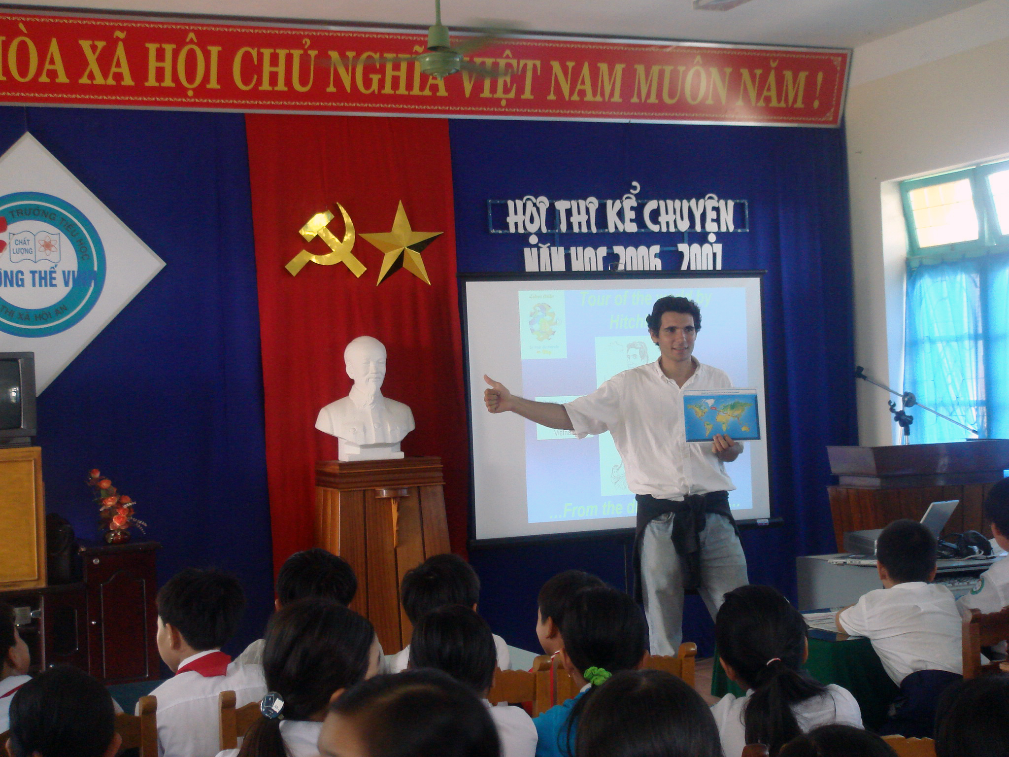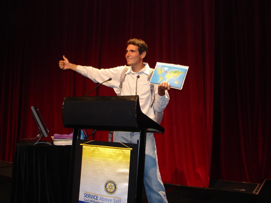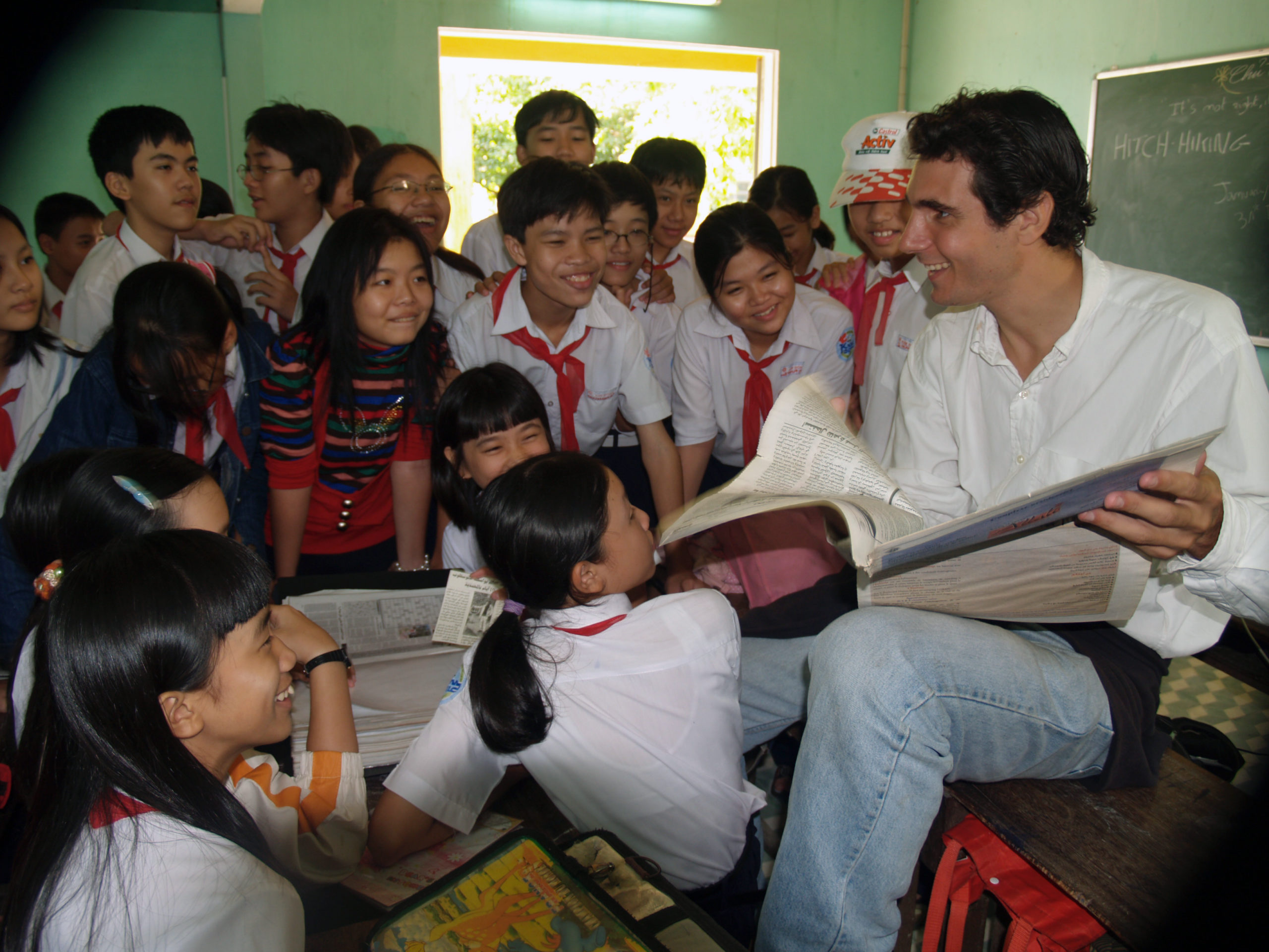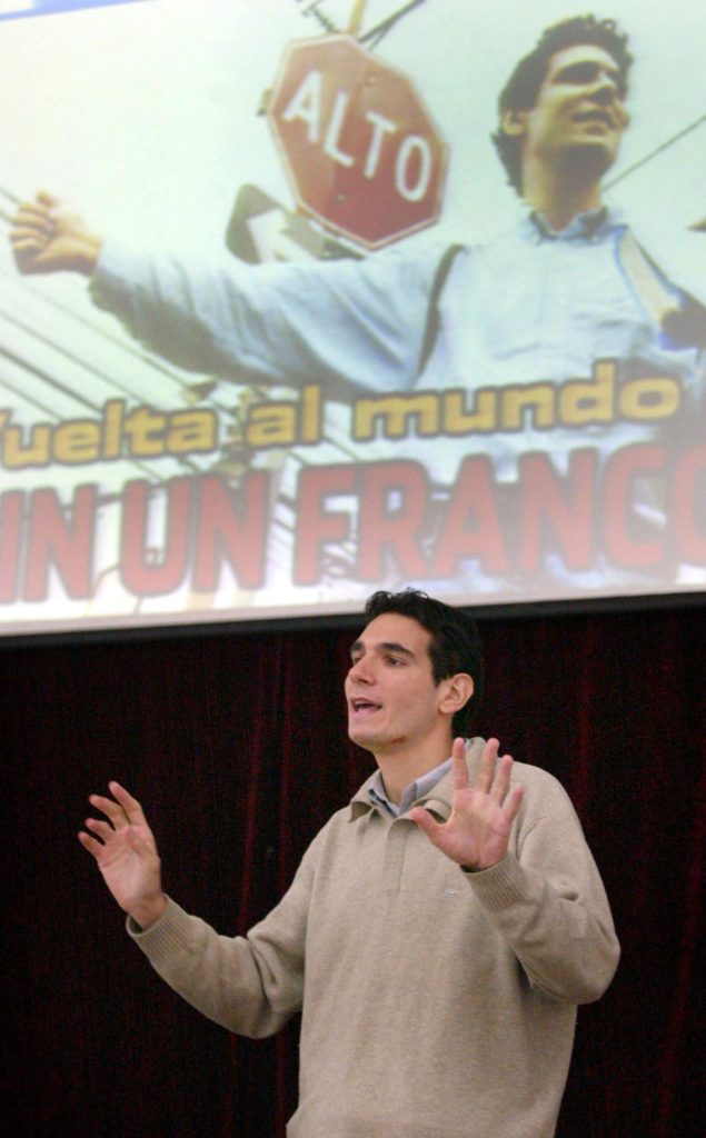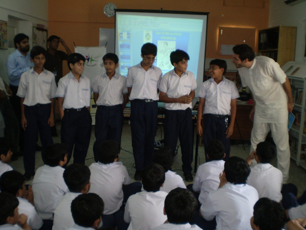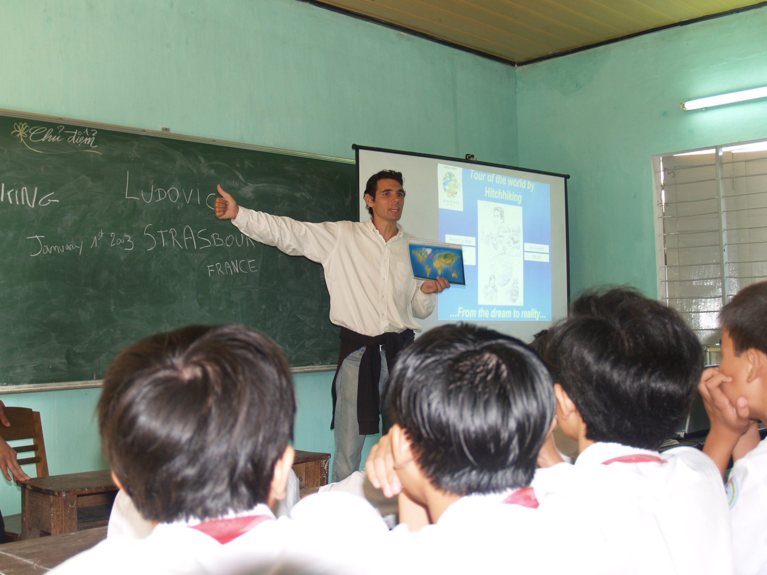 Lors de son tour du monde en stop, il partage son quotidien de voyageur directement avec les jeunes :