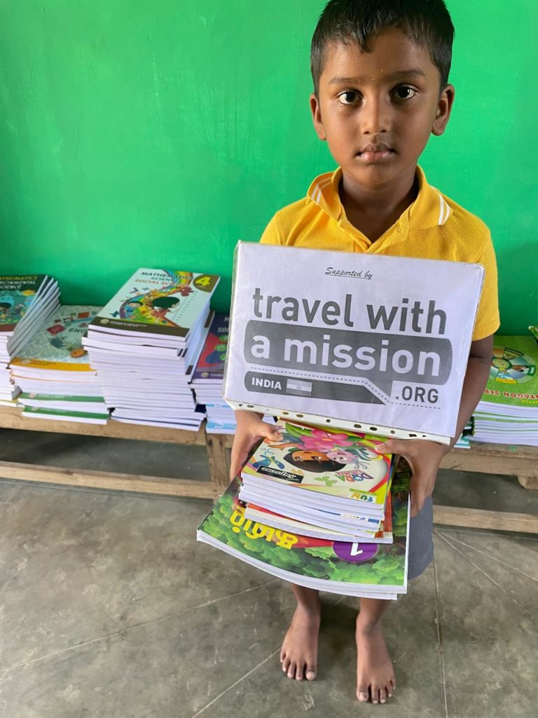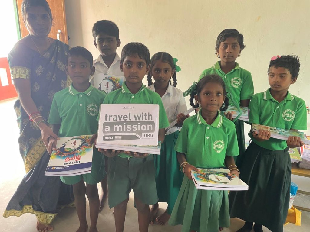 Avant de partir, un don d’un kit éducation (cahiers, stylos, etc.) fut réalisé dans le cadre du partenariat entre TWAM et l’association partenaire VET (Vallalar Educational Trust).