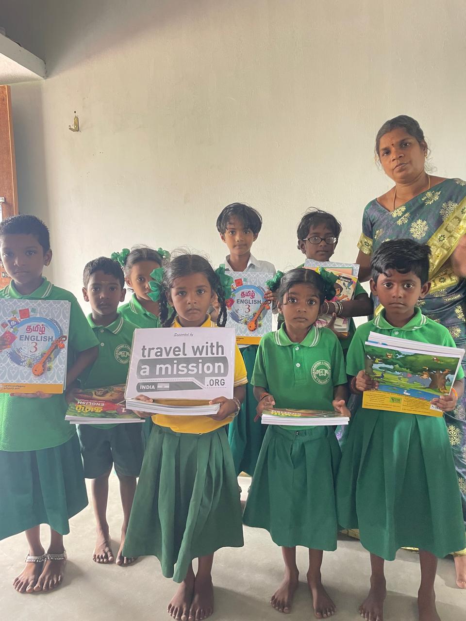 Avant de partir, un don d’un kit éducation (cahiers, stylos, etc.) fut réalisé dans le cadre du partenariat entre TWAM et l’association partenaire VET (Vallalar Educational Trust).