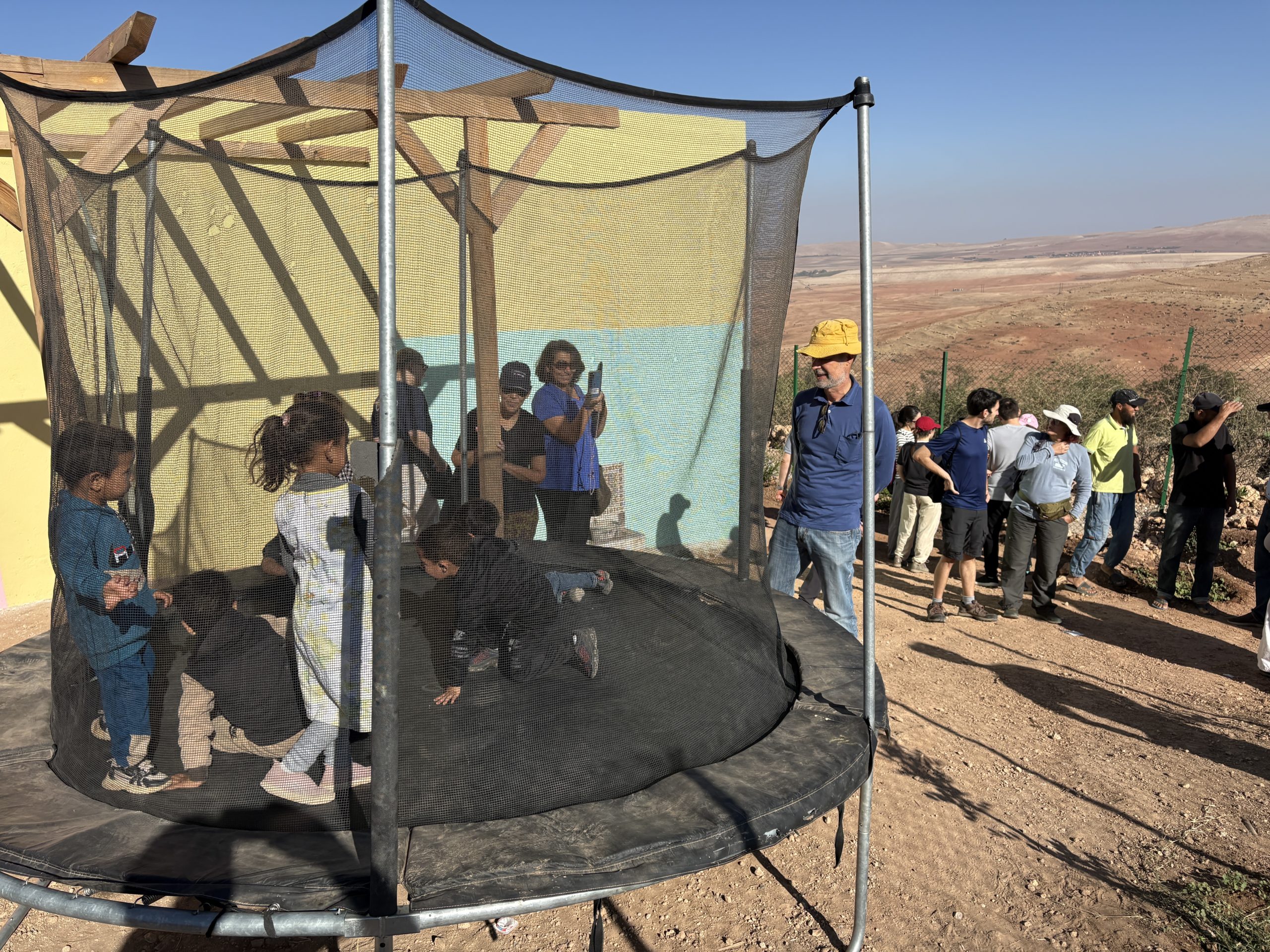 • aménagement d’une cour de récréation avec trampoline et jeux pour les enfants.